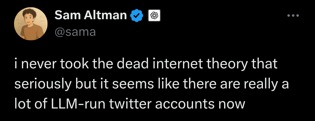 arrow-up11arrow-down1imageOpenAI(ChatGPT Developer) CEO, Sam Altman, suggests the Dead Internet Theory might be correctplus-squarei.imgur.comPro@programming.devMEnglish · edit-22 months agomessage-square0fedilink