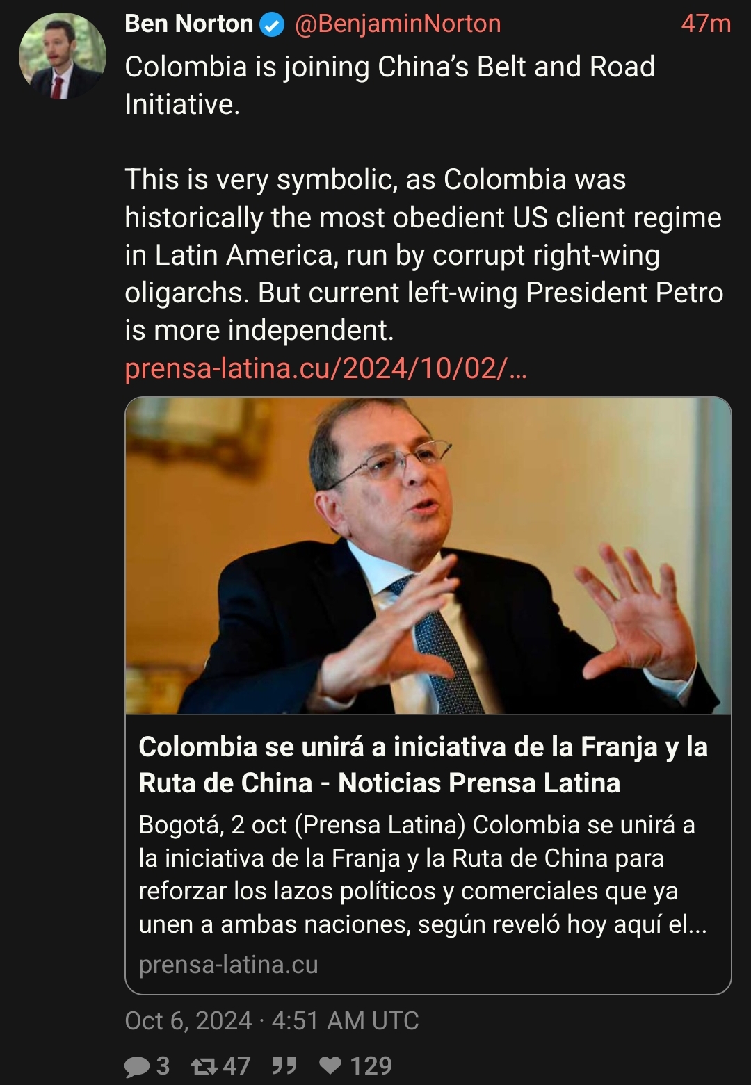 Southern Boy@lemmy.ml to World News@lemmy.ml · 1 year agoColombia, historically the most obedient US client regime in Latin America, is joining the Belt and Road Initiative!lemmy.mlimagemessage-square35fedilinkarrow-up190arrow-down138file-text