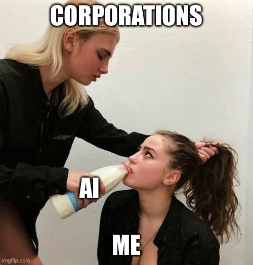 “We’re going to force this AI into every program you use and then because you ‘agreed’ to use it we get to claim ownership of things created with it and use all your data to train it! It’s a win-win (for me only)”