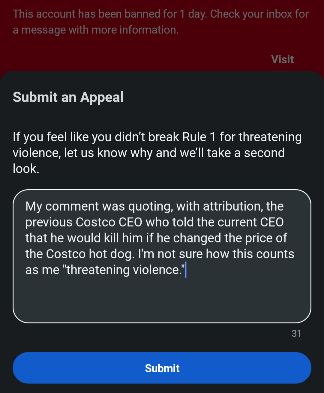 In quotes and attributed, in a conversation about the Costco hot dog. But apparently I’m threatening violence. Lol