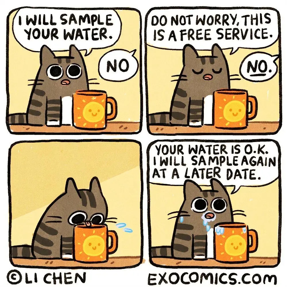 My cats now do exactly as the comic, but I used to have a pair, Max and Minnie (Max/Min) and if the water was too low in the glass, Max would stick his paw in, but Minnie knew that the way you get water out of a glass is to knock it down. So she would just knock it over and lap up the puddle, no glass was safe.