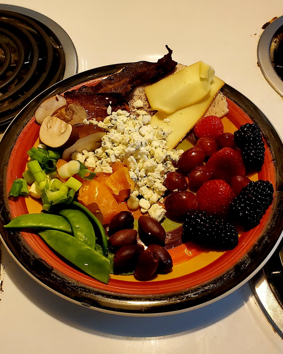 Bacon Turkey Mushrooms Green onion Garlic clove Sugar Peas Kalamata Olives Habanero Gruyere Bleu cheese Red grapes Blackberries Strawberries Honey