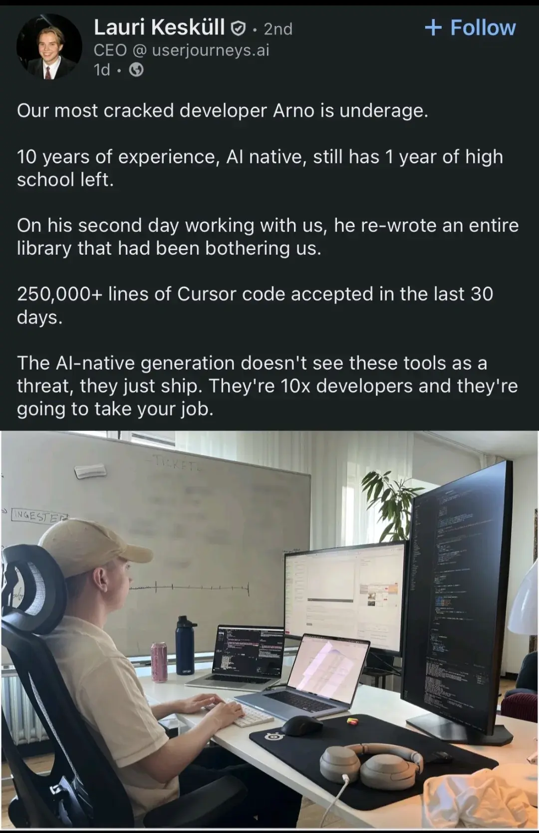 He is being presented as a person who is being tasked with writing entire code bases and the same job as a senior developer. Even if we give him the benefit of doubt and assume that he is being paid handsomely (which I doubt since we are all very well aware of the mentality of such people whose sole goal is to use AI coders to pay as less as possible, none if possible), the responsibilities involved in this is a full time job, not the part time job most high schoolers do during summer time. Even then it is not “common” for high schoolers to work unless you have never left US. In many places, there are some that do unfortunately do need to work due to economic reasons. But rarely outside of US it is presented as excellent work ethics and patriotism. It is more common for people in mid to late university years to start working as “interns” not full time developers. Also see: