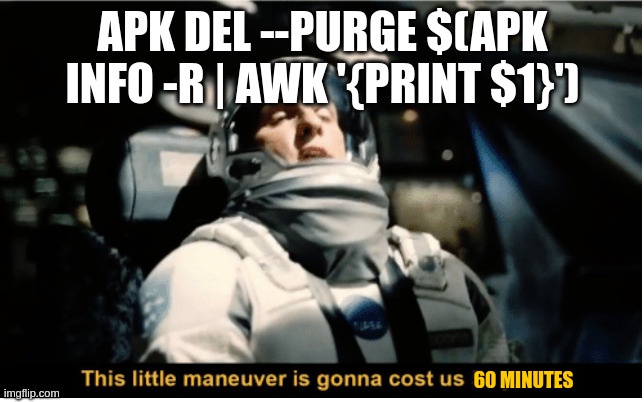 minus-square(っ◕‿◕)っ@lemmy.worldOPlinkfedilinkarrow-up36·3 months ago apk del --purge $(apk info -R | awk ‘{print $1}’) (1/243) Purging alpine-base (3.16.9-r0) (2/243) Purging alpine-baselayout (3.2.0-r23) (3/243) Purging alpine-baselayout-data (3.2.0-r23) (4/243) Purging apk-tools (2.12.9-r3) … it took me that time to restore the system …obviously not being able to boot it anymore. i feel deeply ashamed.