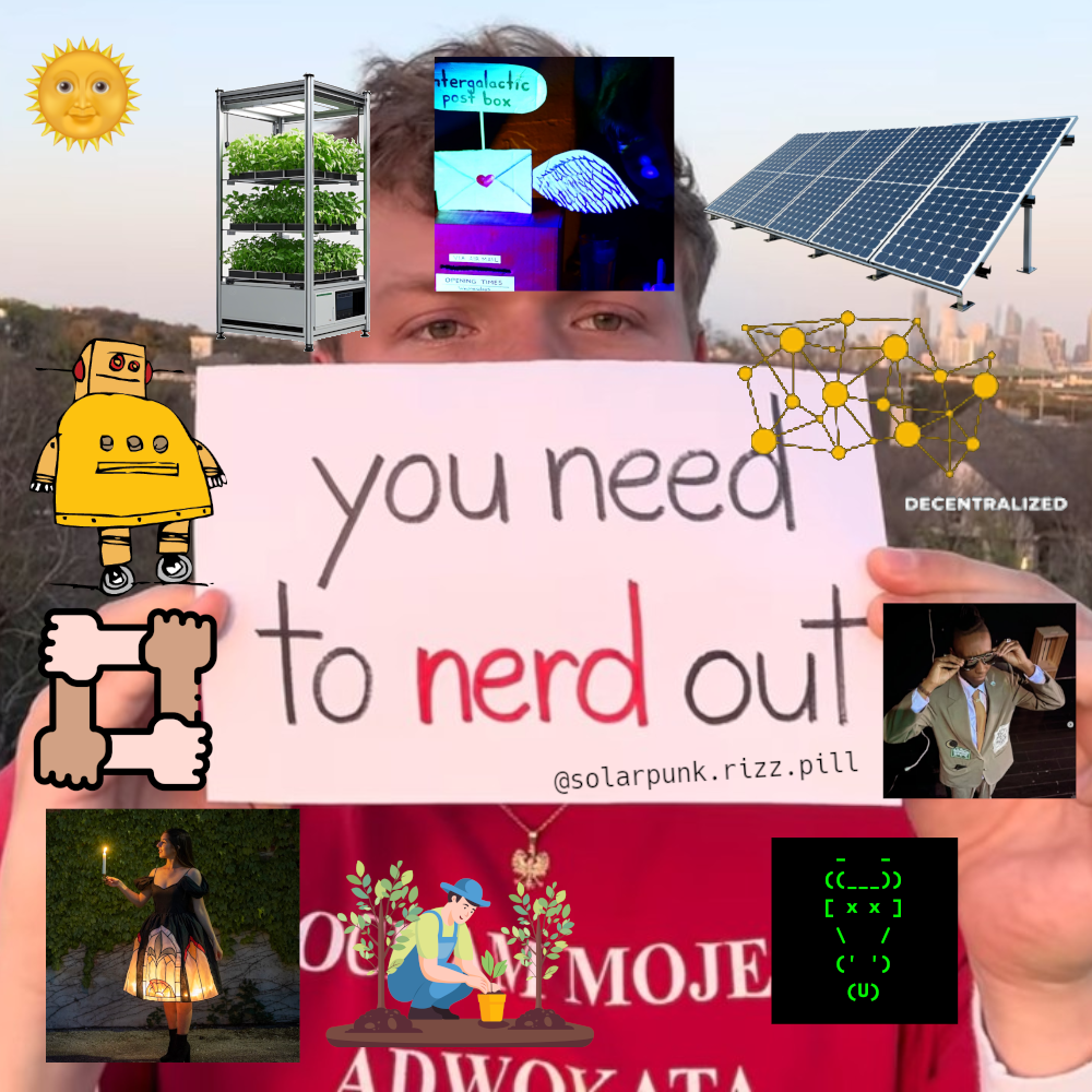1200 London School of Solarpunk: A new free art school for the people of earth (O) 0100 Solar panels: Most efficient self-sustained energy source 0200 Decentralization: The process by which the activities are distributed away from a central authority 0400_1another_: CONNECTING WITH LANOTHER THRU 1 OF 1 UPCYCLED CLOTHING (O) 0500 CDC: Hacktivism, free and open source software and encryption 0600 Gardening: Wether guerilla or not it beautifies the places and combats global warming 0700 shebuildsrobots: o Fashioneering (O) 0800 Collaboration: Globally or locally cooperation always wins over competition 1000 Instructables: Collection of DIY projects empowering makers 1100 Hydroponics: horticulture which involves growing plants without soil in an artificial environment. “smartprinters” (O) = page on instagram