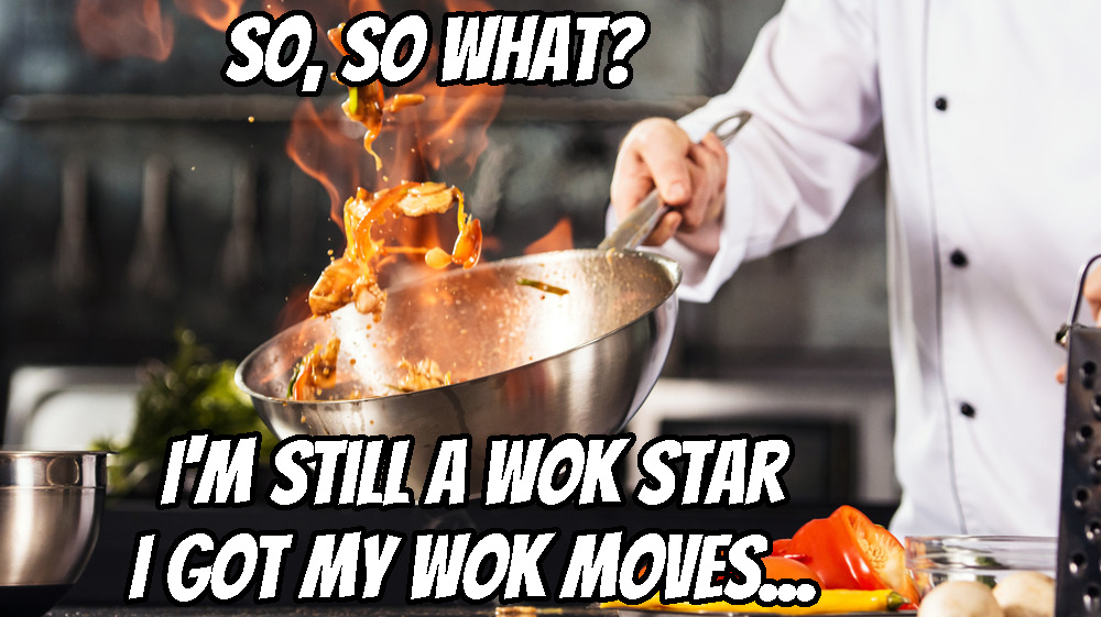 A chef in a white uniform is cooking with a wok. Bold text overlays read, “SO, SO WHAT? I’M STILL A WOK STAR. I GOT MY WOK MOVES…”