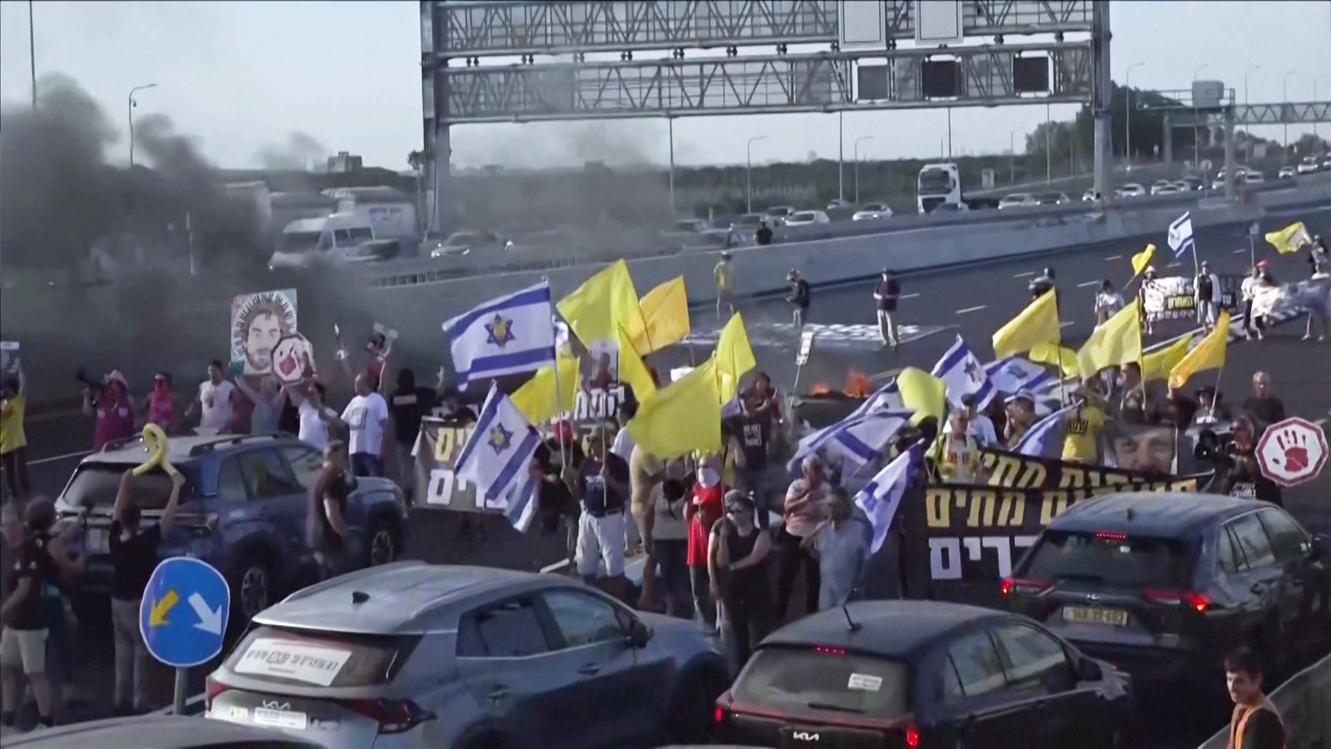 In Israel, thousands of protesters have blocked roads around the country, including a major highway in Tel Aviv, burning tires, calling for the return of the hostages still held in Gaza and an end to Israel’s war on the besieged strip. The protests were led by families of hostages, and part of a nationwide “Day of Disruption.”