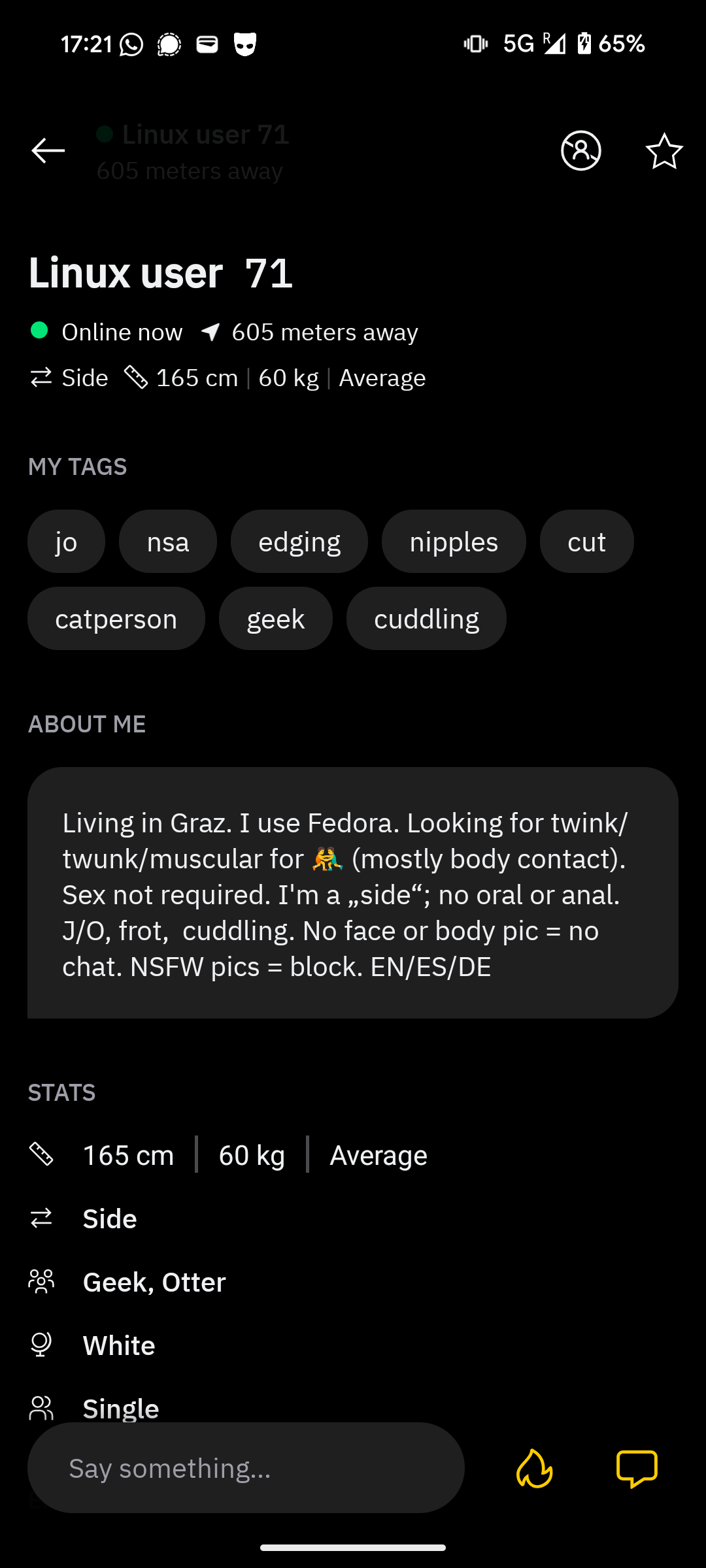 This tracks for how a lot of people use the app, but depending on where you are you can also have some fairly normal (for a dating site) conversations with people as well. I spent a couple months on Grindr despite not being interested in hookups, since it’s a decent way to meet other trans folk in my area. My inbox was mostly dick pics but I also met some amazing people I’m still with several years later!