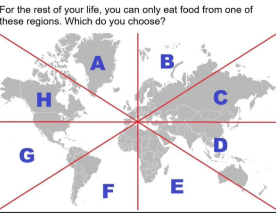 But then that’s food you can eat in Oceania, not food from Oceania. D has a ton of good Asian food, but for traditional Western cuisine you want A or H.