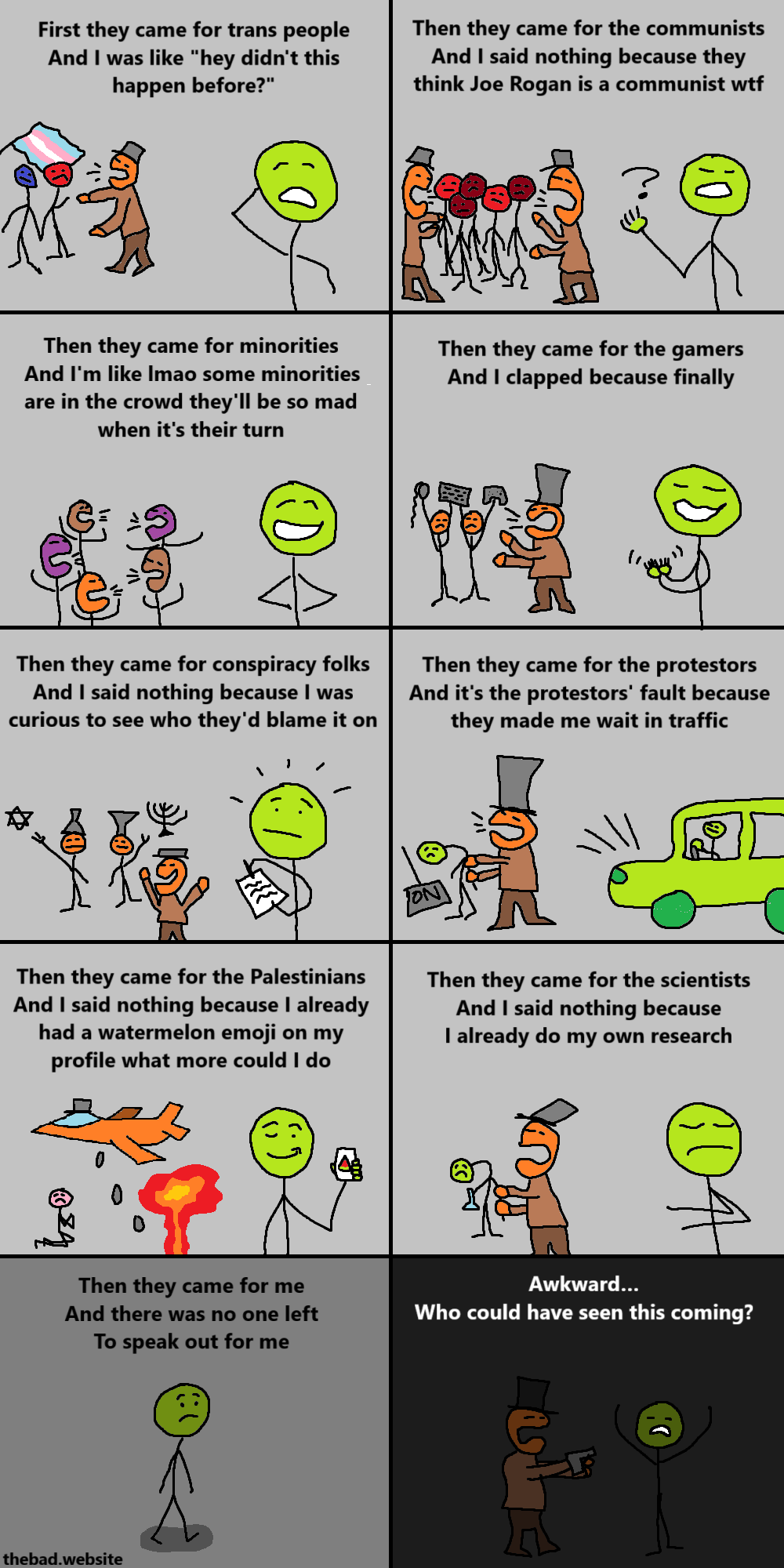 [green looks at orange arresting trans people] First they came for trans people And I was like “hey didn’t this happen before?”