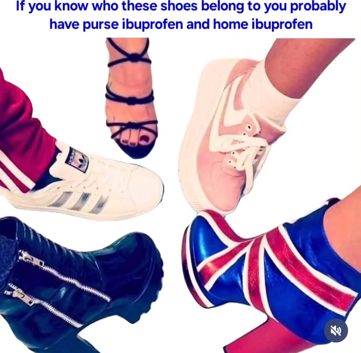 I having some now from my desk supply of ibuprofen, but I do also have some garage ibuprofen and some bedroom ibuprofen … the best part is that I am a big brown long haired Native guy that knows these damned lyrics … and I’m embarrassed to say I know who all the shoes belong to - clockwise from the Union Jack high heel - Ginger, Scary, Sporty, Posh, Baby.