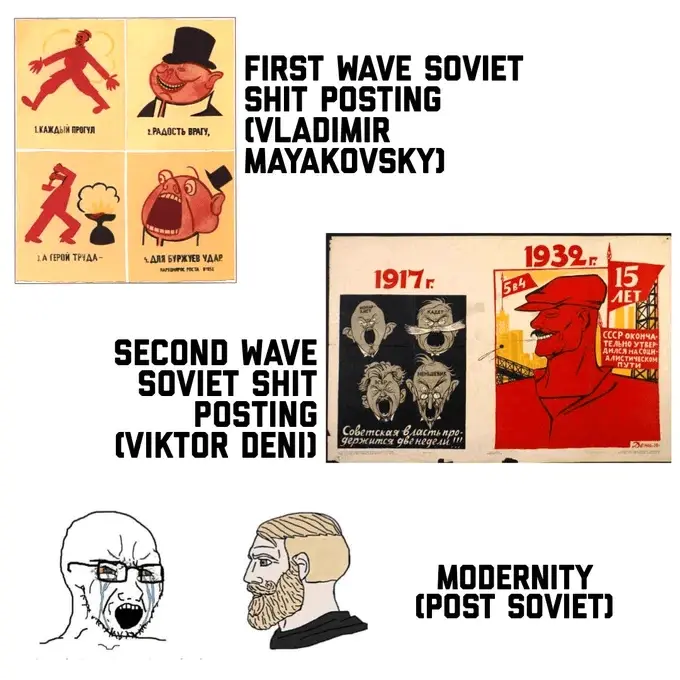 The soyjacks on the soviet version correspond to Cadets, Trotskyists, Mensheviks, and Capitalists, IIRC.