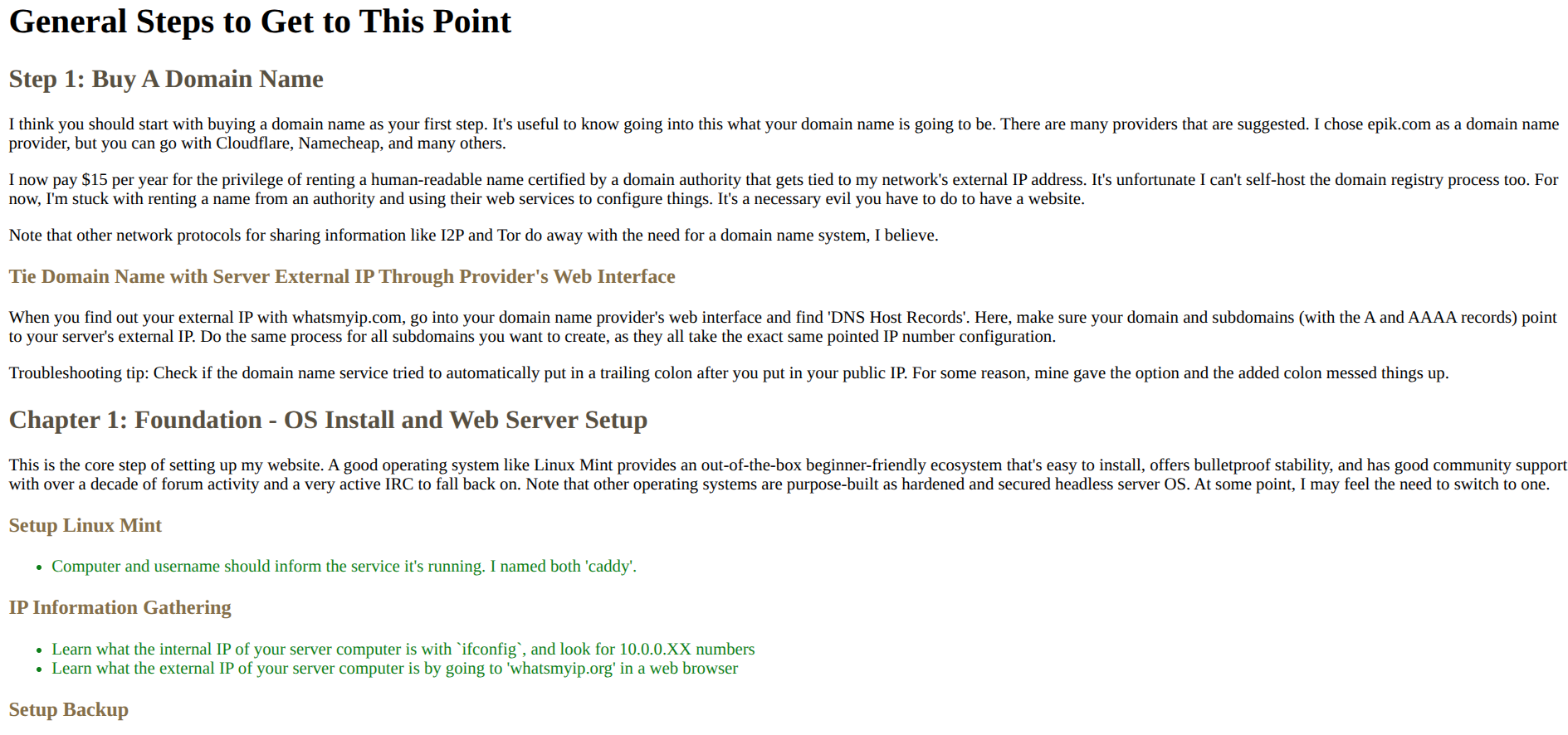 Similar story here! A couple years ago learning about Gemini/gopher/smallnet from mentaloutlaw videos. So I joined a public access Unix server (first SDF later tilde.team) and learned how to write my own capsule site for a few years. Learned some basic .CGI bin and awk processing to create a gemtext to epub converter that made small ebooks of daily post in atom feed. It was like training wheels really helped prepare me for the transition to full self hosting capsule and website