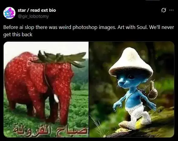 This meme says Morning of Strawberries (صباح الفراولة) which is both clunky (Arabic’s got a poetic quality and these two words put together just intuitively do not work that way. It has the meter of a punchline if that makes sense) and silly, but with the textured elephant and the 13x12 resolution as you can probably guess it’s just a surreal meme.