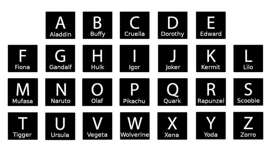 The NATO phonetics are so tired and old. This one uses popular fictional characters instead: