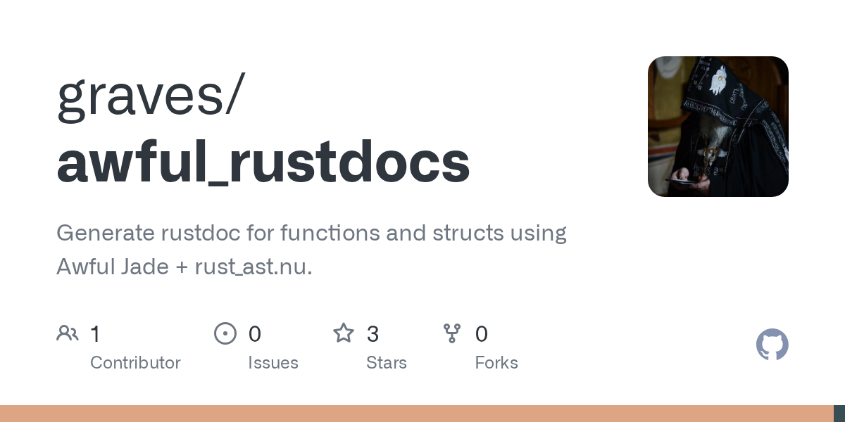 Awful Rustdocs is a CLI tool that generates or improves Rustdoc comments by harvesting symbols via rust_ast.nu, enriching each item with ast-grep context (callers, intra-body calls, qualified paths), and prompting your LLM to produce concise, high-quality docs.