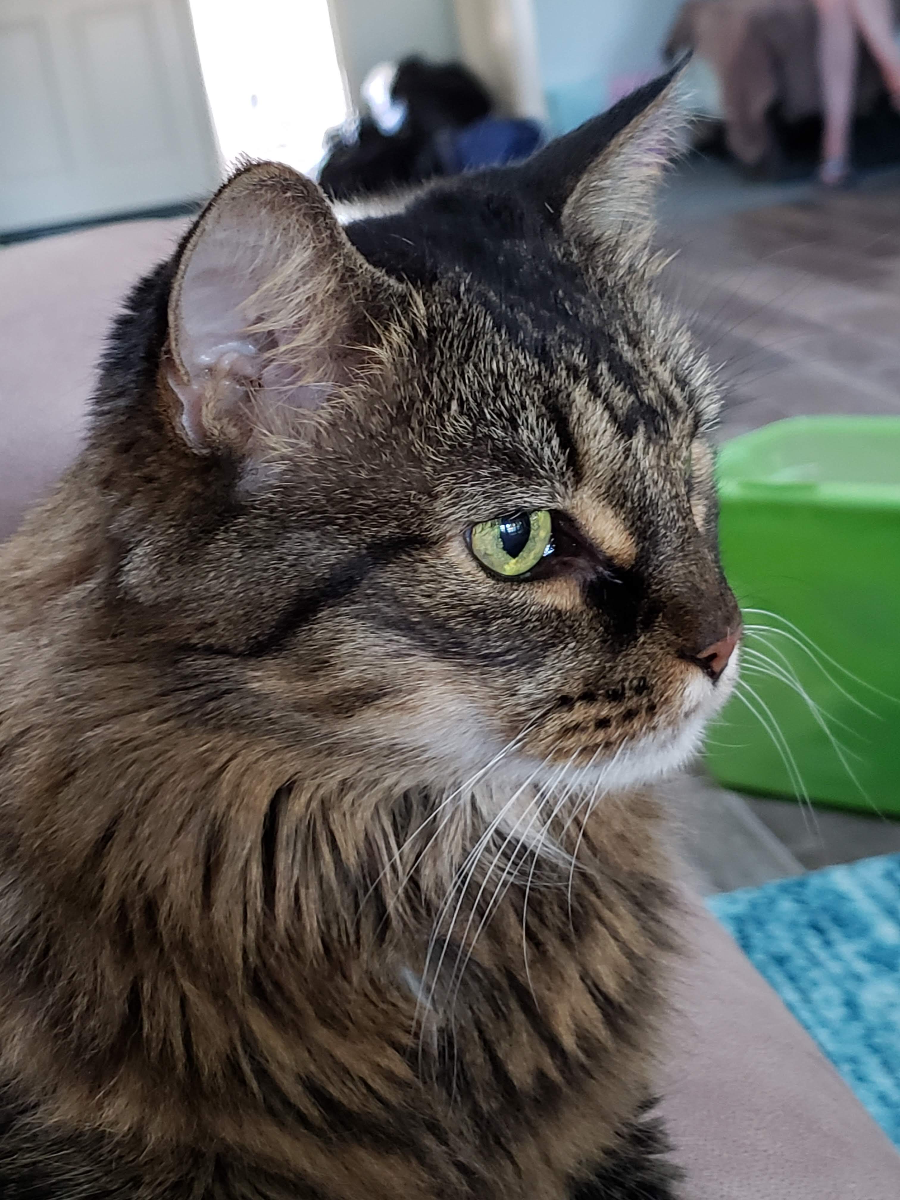 She was dumped in a shelter, part main coon and all heart. Was like winning the lottery when we rescued her. Unlike her housemates who would scatter and hide when the doorbell rang, she would relish the opportunity to meet and greet another human. Liked to be picked up and held. Had this little hitch in her meow that made it sound like wickety - wow.