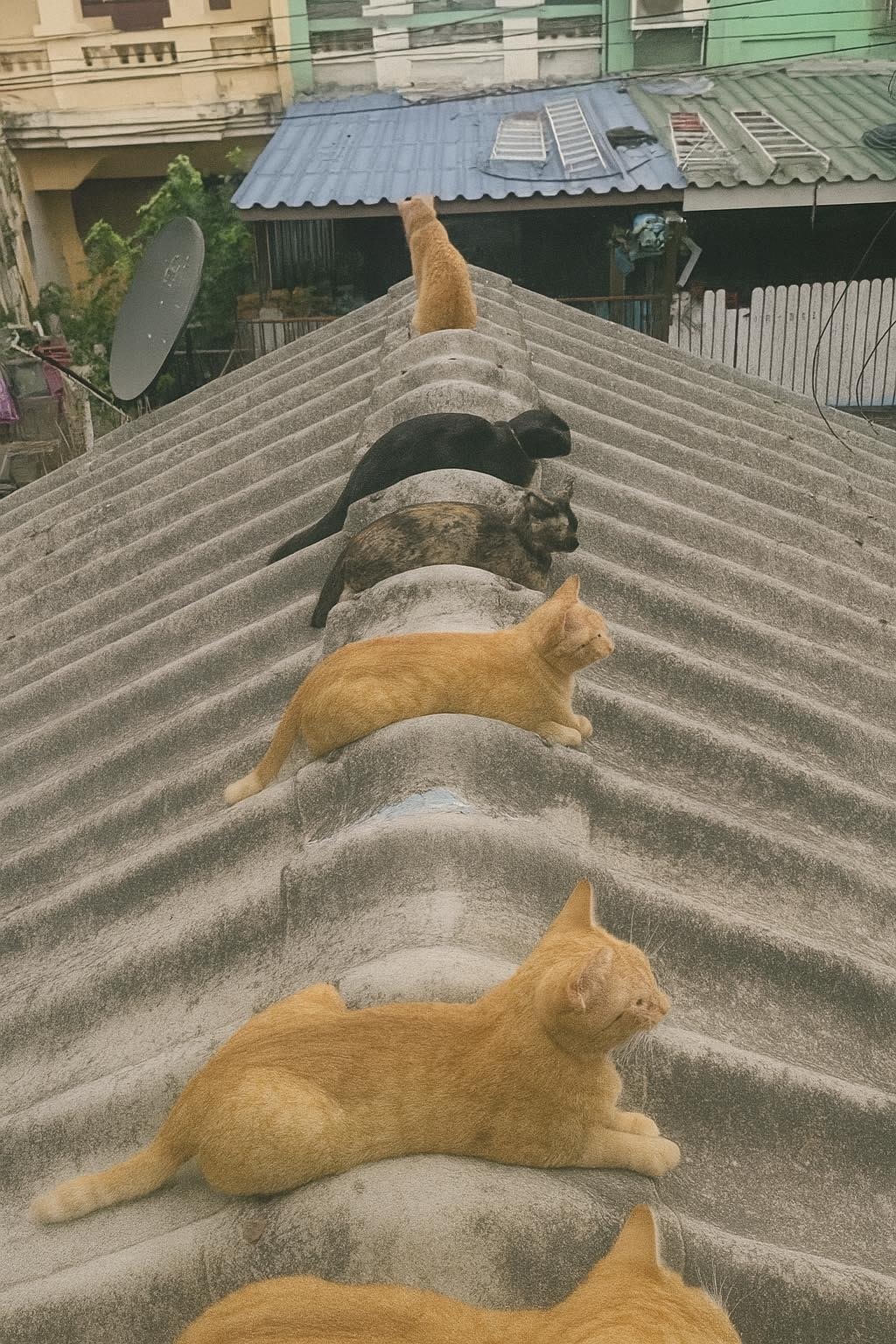 Asbestos kitties! Anyone cuddling these cats will be snuffling the asbestos fibres deep into their lungs; how much, depending on how weathered the AC sheeting is.