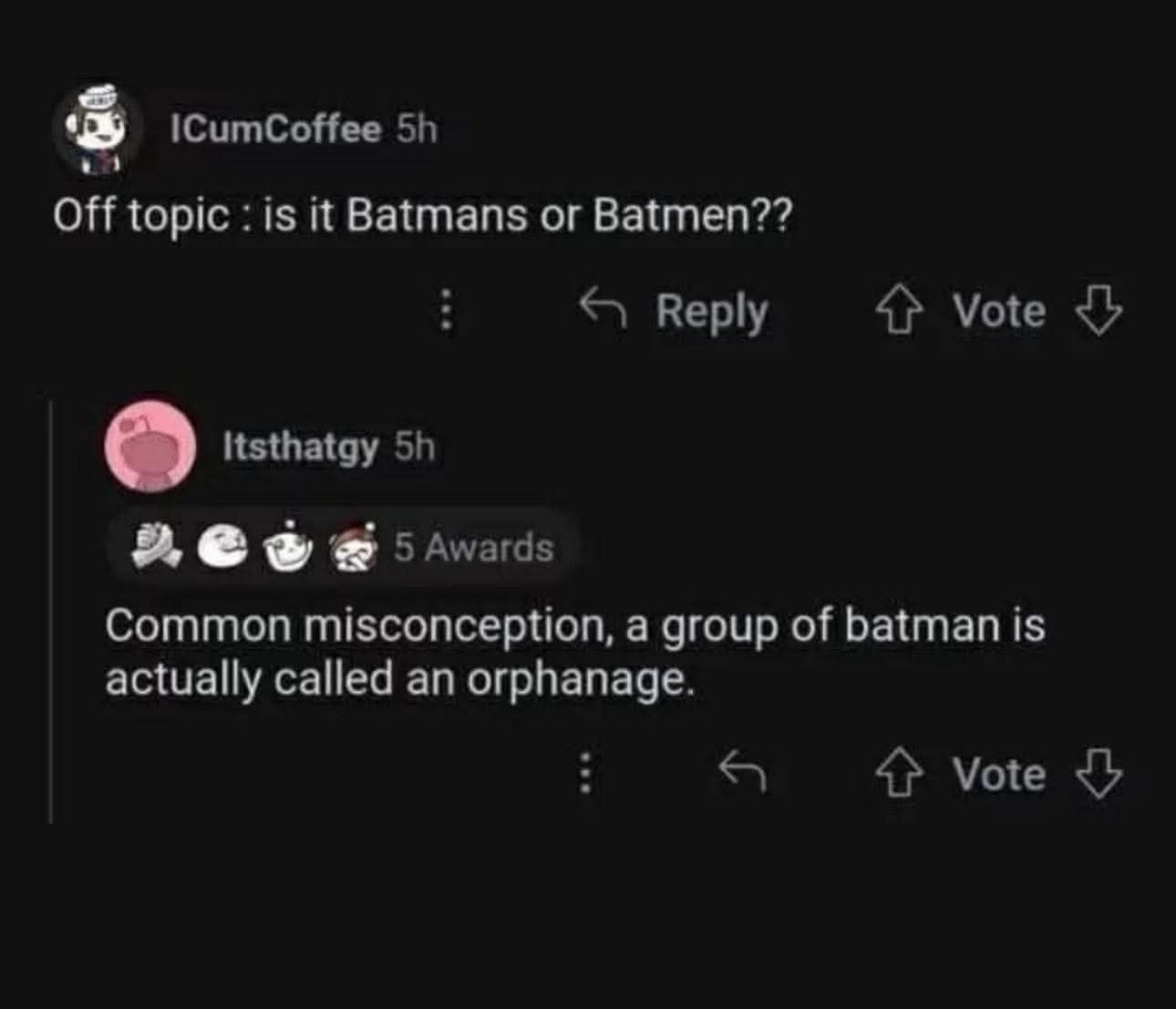 Dav09@mander.xyz to Reddit@lemmy.worldEnglish · 8 days agoBatmenmander.xyzimagemessage-square10fedilinkarrow-up1345arrow-down16
