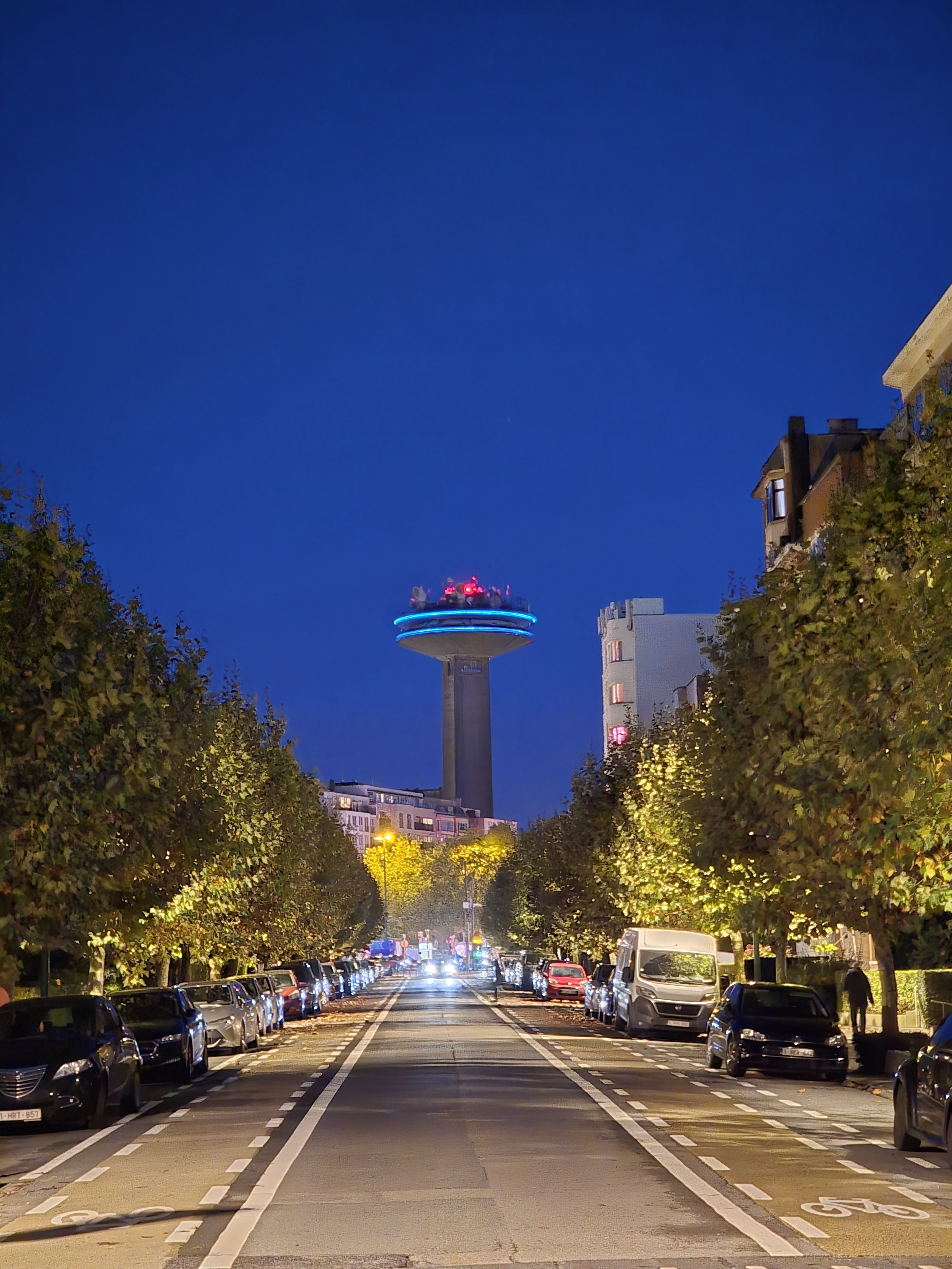 Edit: it’s this tower, the article has a daylight picture. https://fr.wikipedia.org/wiki/Tour_Reyersinterestingly, I can’t find any source that says why it’s shape like that. Aparently it was always planned to be a radio tower.