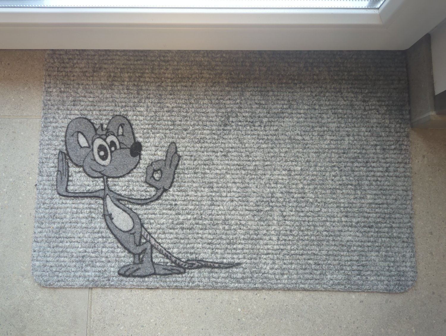 I’m confused at what I’m looking at here. Is that a carpet with a cartoon rat on it hung on an exterior wall? Why?