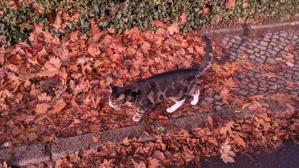 Looks like a bunch of leaves on a sidewalk with a cat.