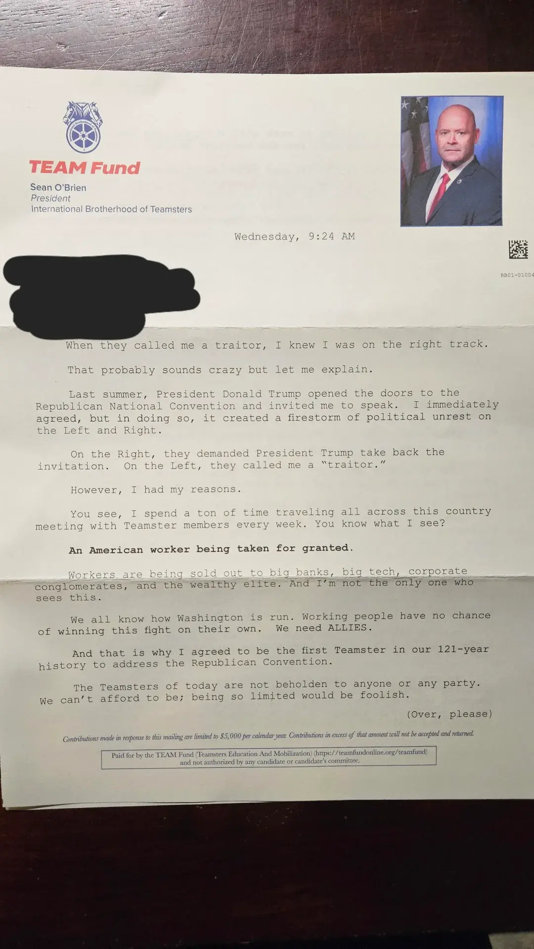 In the letter, Sean O’Brien claims that Trump is creating a new ‘Worker First’ republican party, and implores the reader to donate as much as they can to the Teamster ‘TEAM Fund’, which will be used to: