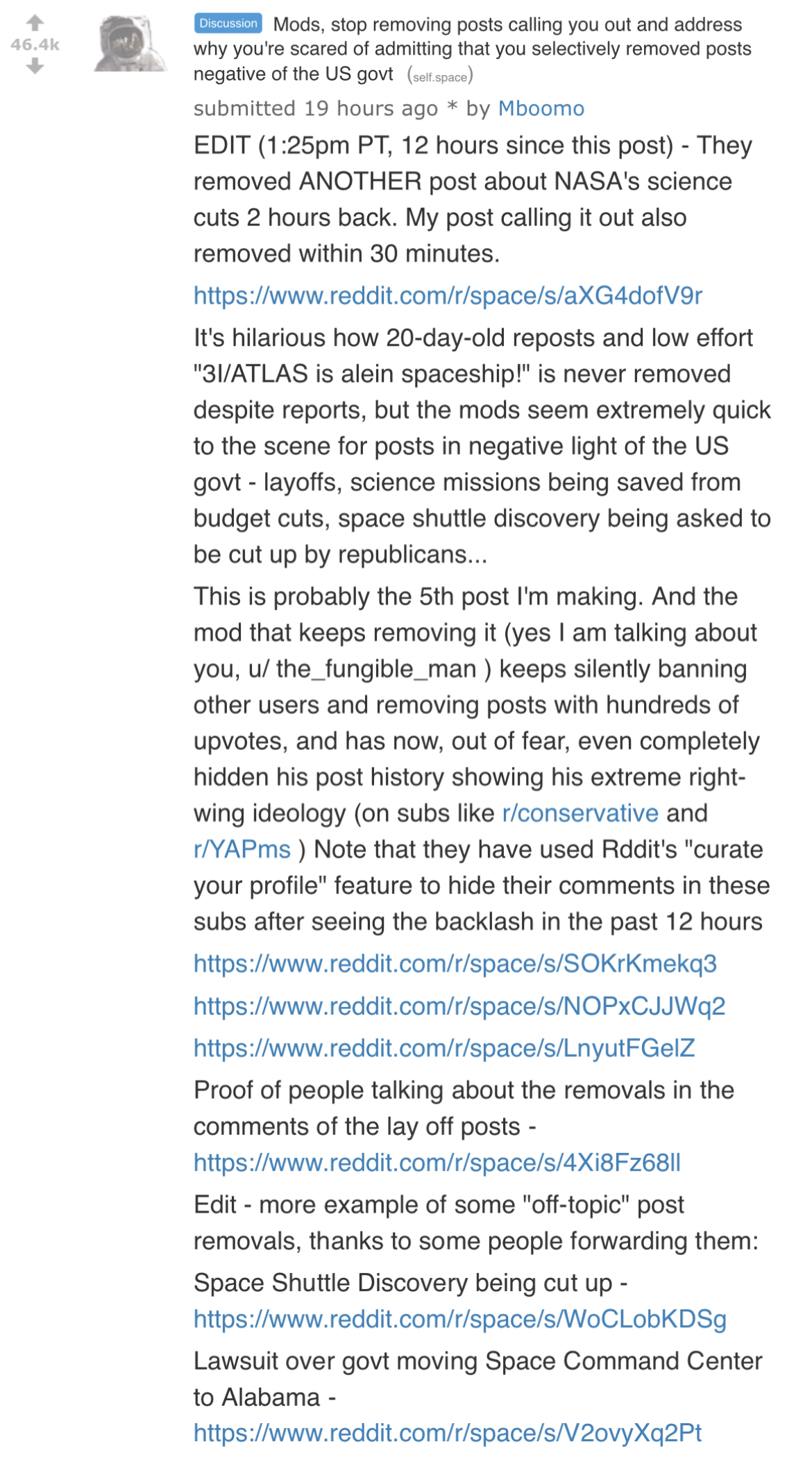 andros_rex@lemmy.world to Reddit@lemmy.world · 6 days agor/space removing posts critical of the Trump regimelemmy.worldimagemessage-square19fedilinkarrow-up1267arrow-down10file-text