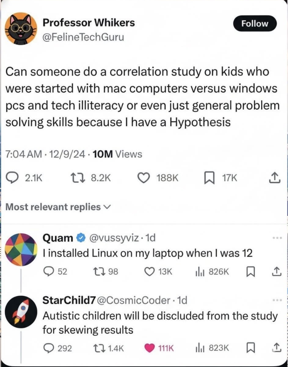 Ah, that’s true and I misunderstood you then. Though it’s hard for me to understand how that implies tech literacy in a total sense, since my grandpa has had a pc in and from the 20th century and while literate on tech given his generation, he is really not comparable to gen y-alpha. I would also wonder how this compares to devs, since most of them grow up relatively the same. PC in front of them, seeing code, monkey see monkey do, wam bam bap, software developer. I am in my 20s so I do not have knowledge about the first personal computers.