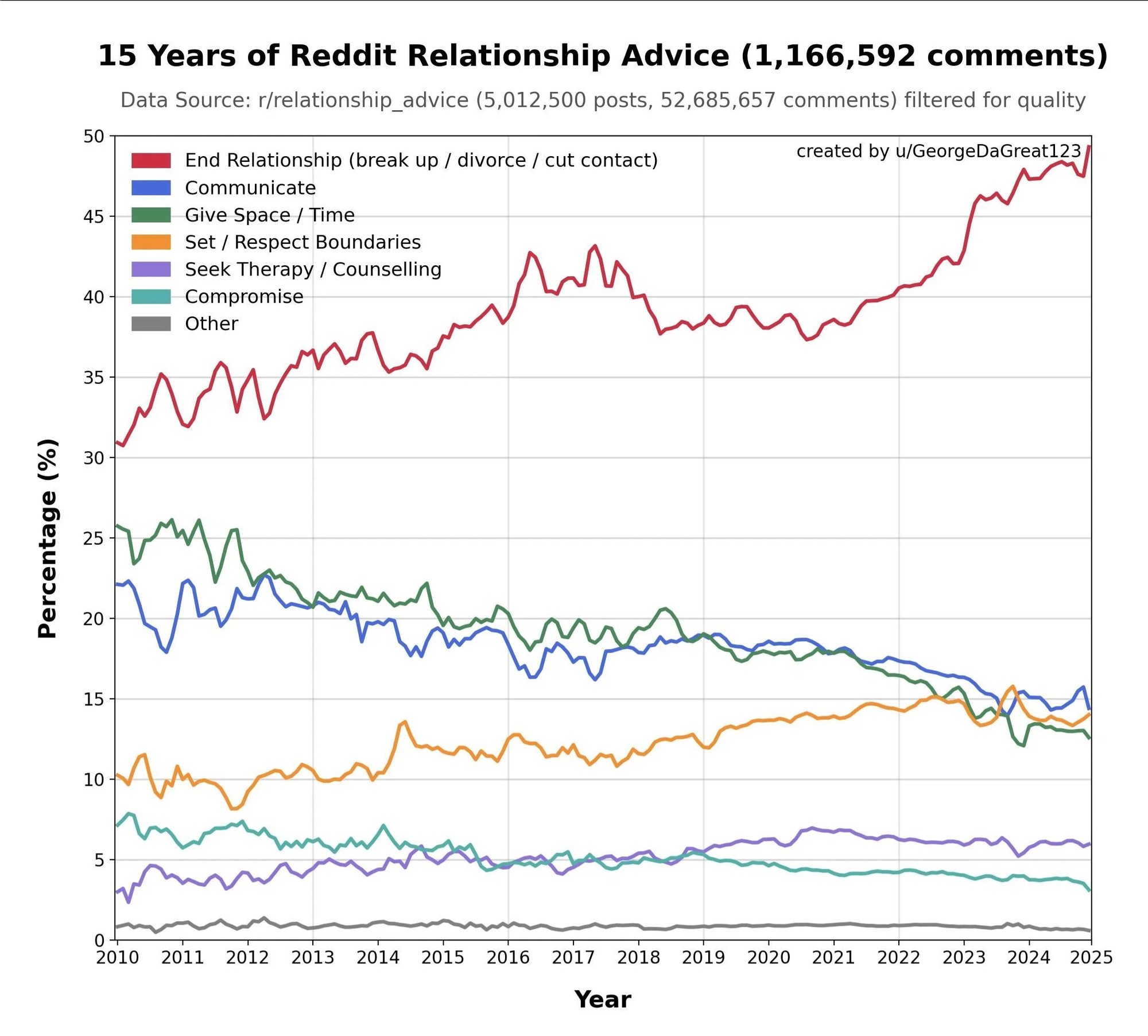 While bots seem like the obvious answer, there’s also a possibility of demographic shift over time towards a younger and more mainstream commenting/posting population. More young adults with no baggage asking for advice means cutting ties is more likely to be a novel suggestion for them and has less friction, and more young adults (and, frankly, kids) in the commenting population means less nuance, more “edge”, and generally more advocating for hot-takes that have attracted upvotes in the past.