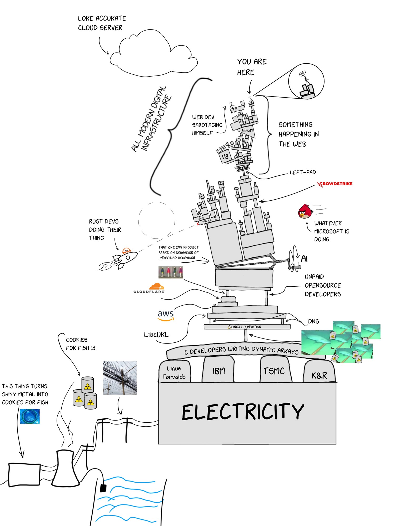 In all seriousness though, the core of the technical stack has become very robust in my opinion (DNS being the exception). From a hobbyist’s perspective, things work much better than when the Web was still young. I can run multiple sites (some of them being what are today called apps) on a domain with subdomains, everything fast, HTTP3-capable, secured via valid free TLS certs, reverse proxied, all of that running on a system deployed in minutes…