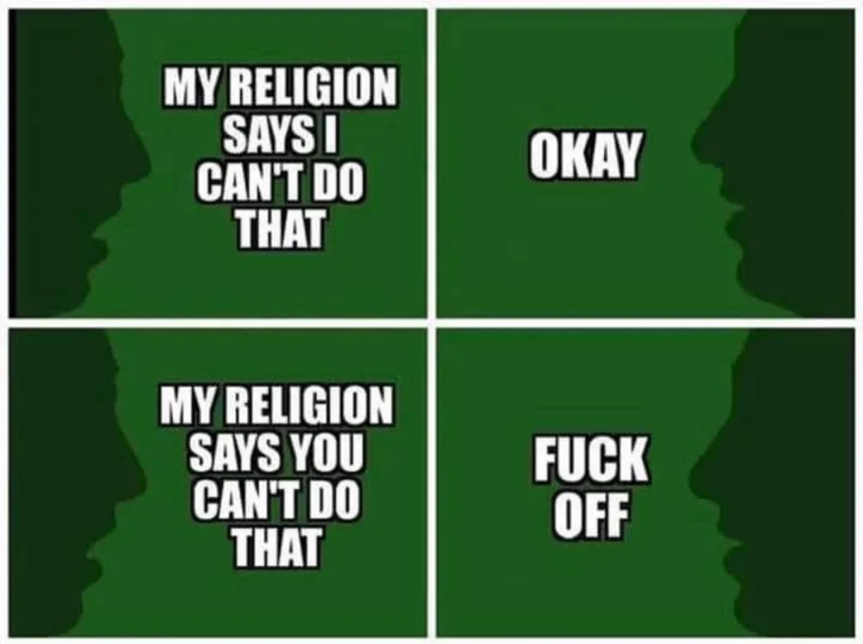 I don’t have a religion so anyone that uses their’s to try to enforce their rules on me can hang