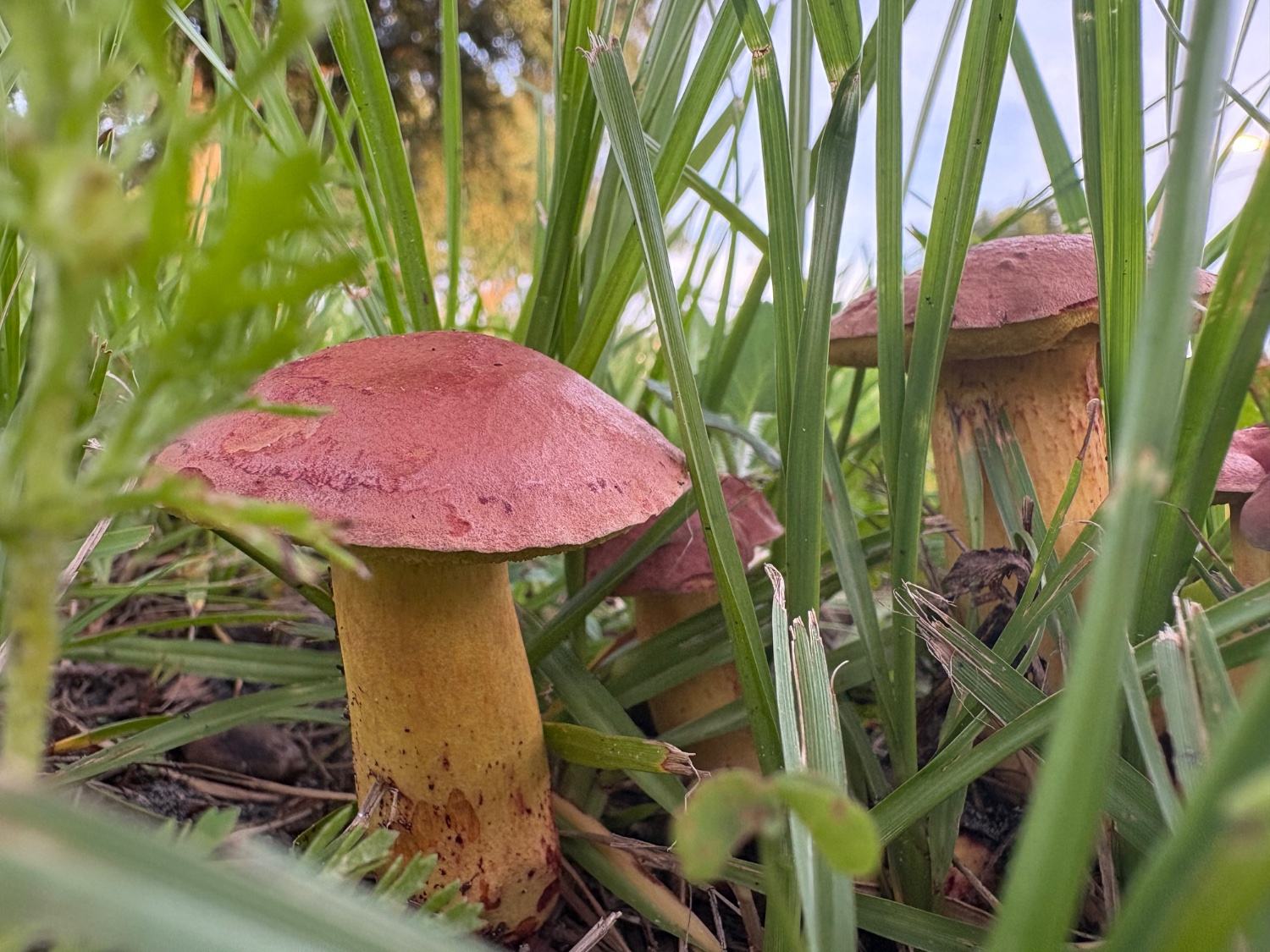 Thank you both for the info! Here is another photo of a mushroom near the others that looks to me to be the same species. I did not knock it over, it was already like that. I’m too worried to forage for mushrooms but I think they’re beautiful.