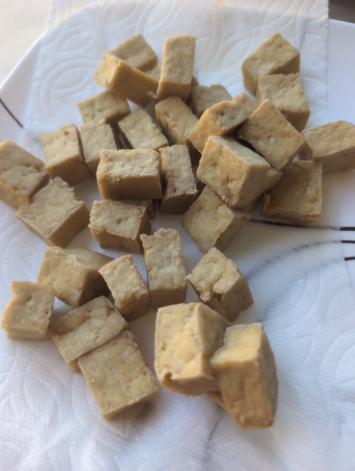 Hands down, I am absolutely convinced after years of eating tofu that deep frying it is the standard way to go. This is why any time you go to Chinese, take out, or Thai food, wherever, in order the tofu, it’s been cubed and deep fried, exactly like in this photo. You then simply swap it into whatever dish you want as the protein. The texture is really nice. It’s like firm meaty chunks of food. But it isn’t crunchy. This way mimics actual meat in terms of texture, but it needs sauce of some kid as its essentially flavorless.