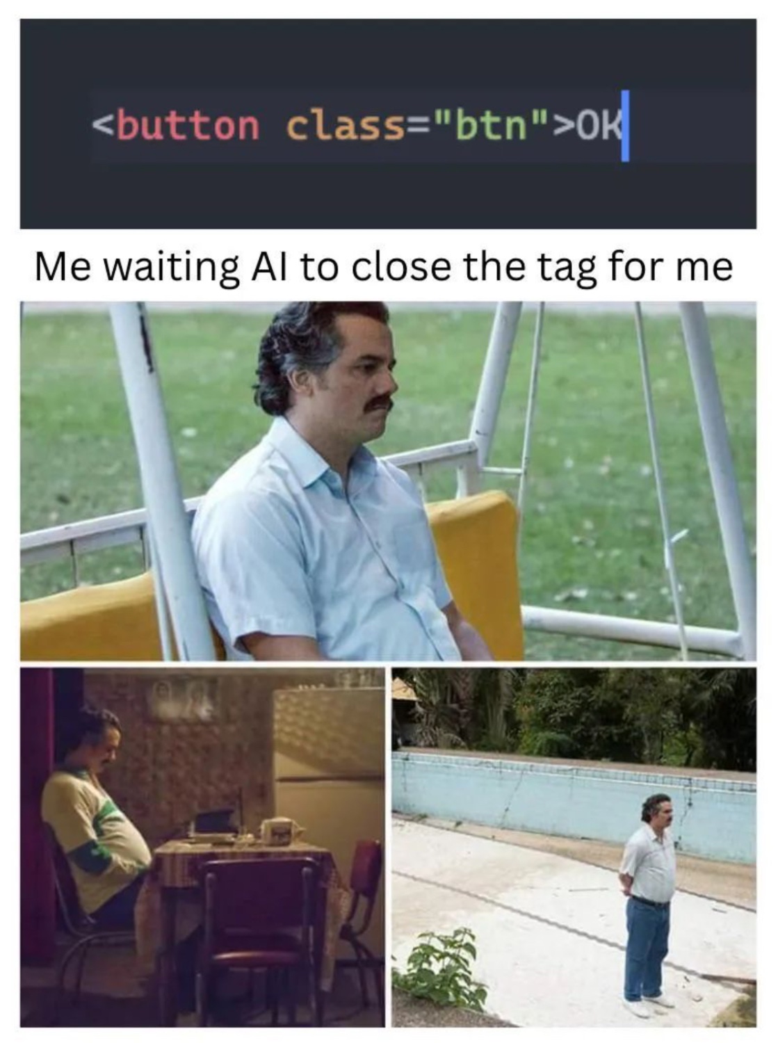 Programmer Humor@programming.dev•Me waiting for the AI to close the tag for me